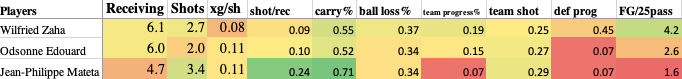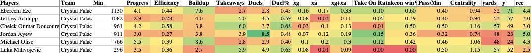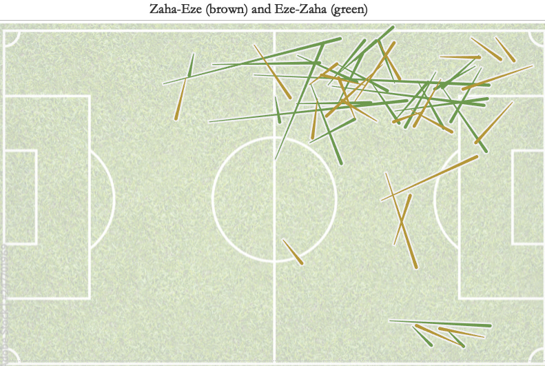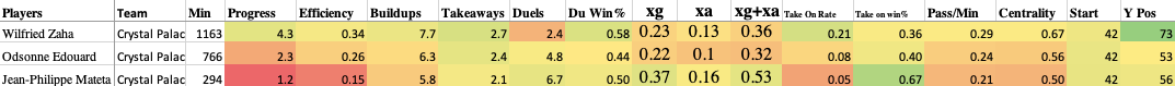 Zaha is the real attacking hub here, he doesn’t take on players as much as he used to but is still somewhat a threat to carry. He probably would carry a much bigger threat with a true partner, and not the one-dimensional Mateta and the mediocre Edouard.