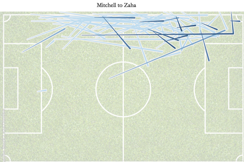 The left is Zaha’s side, meaning Mitchell has more options to work with, and more defensive work to do. Mitchell is much more aggressive with the ball, but inefficient as he loses it a ton.