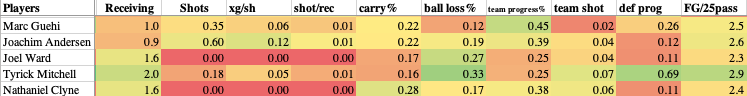 Guehi’s passing efficiency was top-notch but I like Andersen as the better current defender due to his duel win rate and ability to get involved in shot builds.