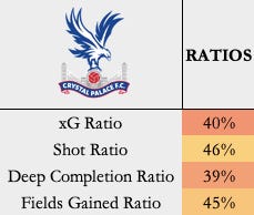 Shot quality is obviously the big problem for Palace, as their low volume danger touch attack is coupled with awful sub .08 xg/shot.