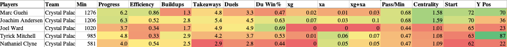 The simple fact the fullbacks are so withdrawn (62+ yards start on average) to show up in this category shows how much work Palace must do to get ball forward. They are the first team that fullbacks didn’t show up in the midfield.