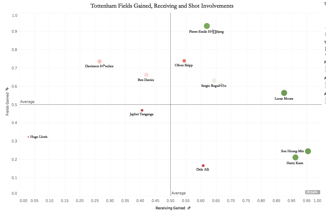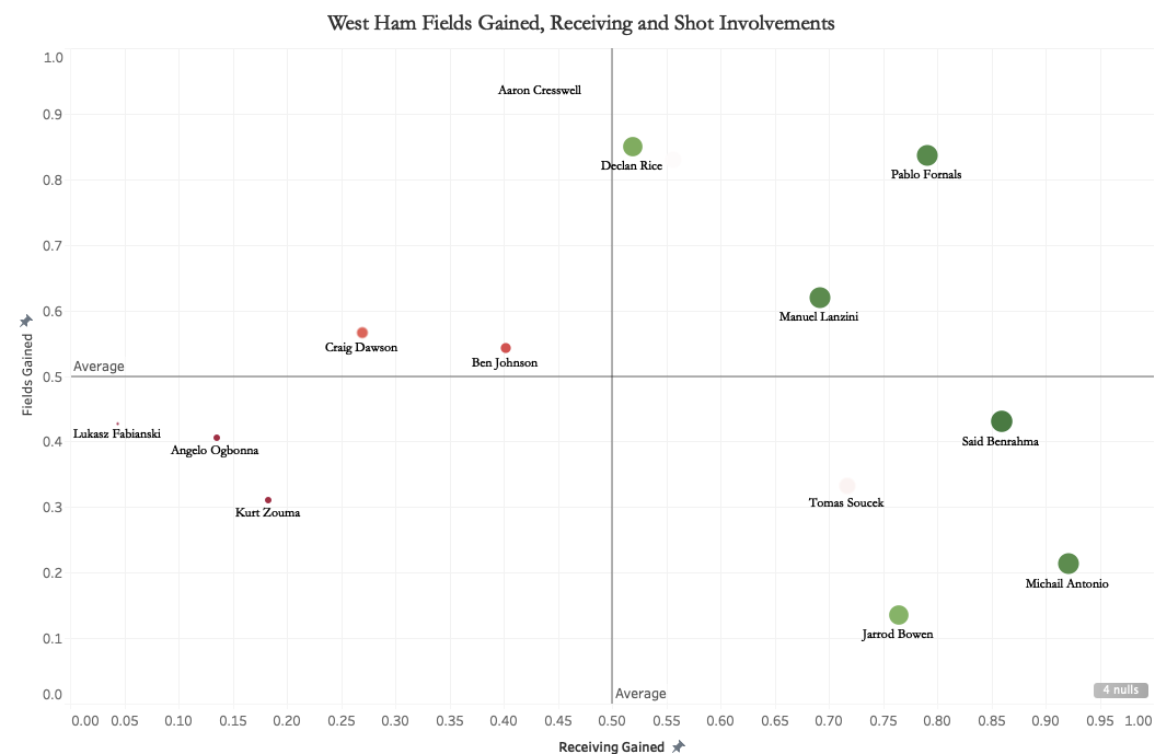 Fields Gained Per 90: carrying and passing yardage per 90, if you progress the ball 10 yards from 100 yards away that’s 0.1 Fields Gained (10% of the field)…if you progress the ball 3 yards from 30 yards away, that’s also 0.1 Fields Gained.